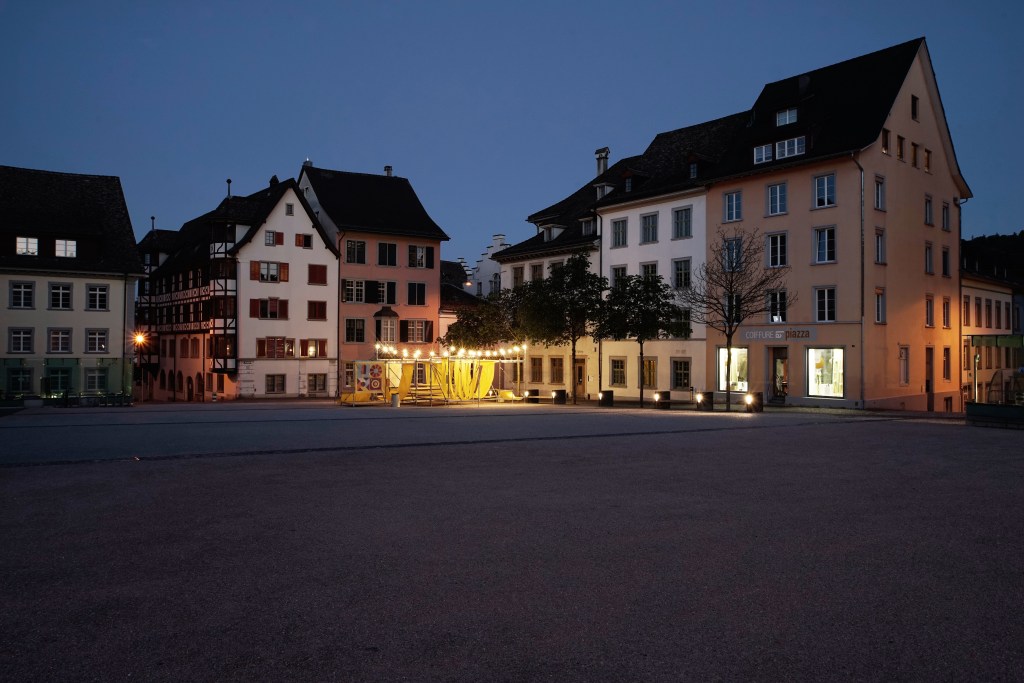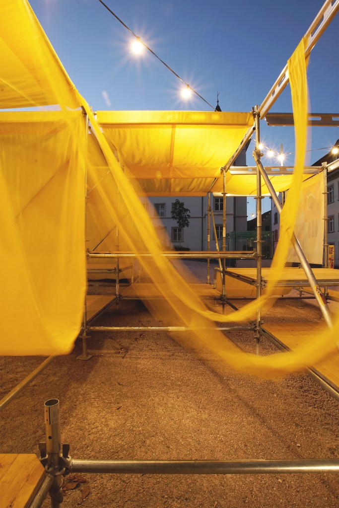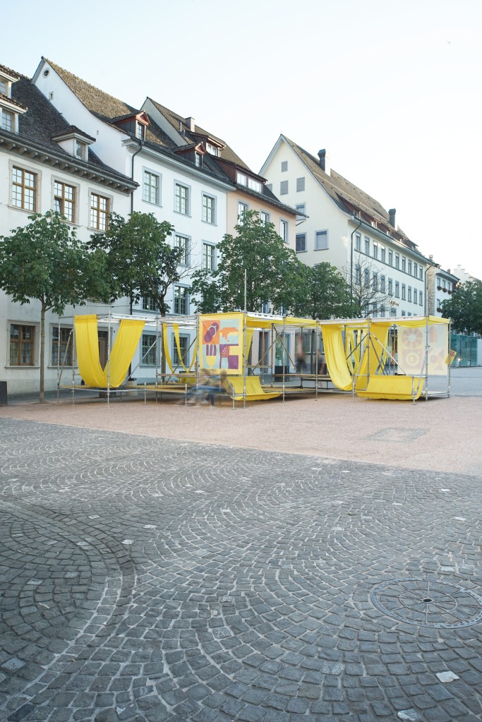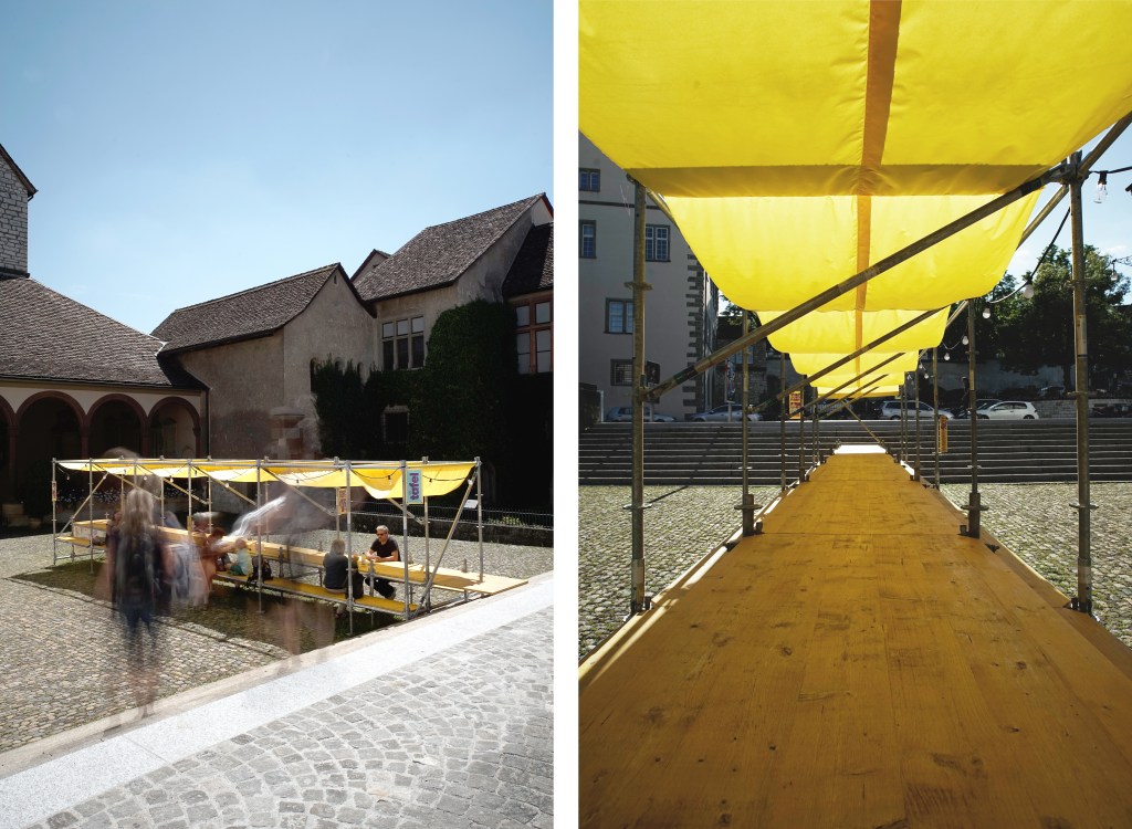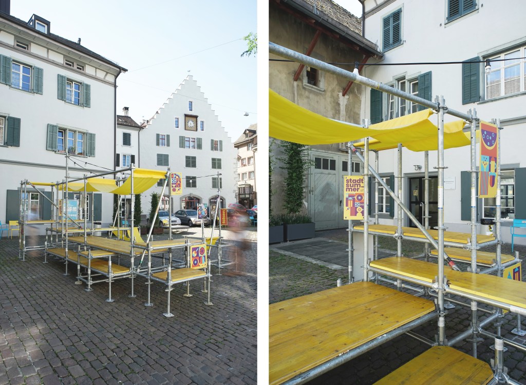 In collaboration with a supportive coalition comprising individuals from Schaffhausen’s gastronomy sector, design scene, politics, and business, POSITIF STUDIO, for and with Dost Architektur, developed temporary urban furniture made from scaffolding, wood, and yellow fabric during the summer of the COVID-19 crisis. The goal was to draw attention to the local gastronomy scene and make the urban space an attractive culinary destination.