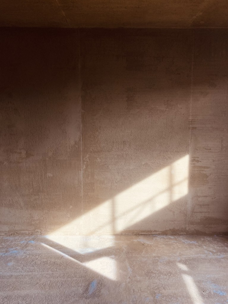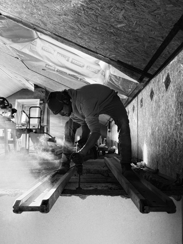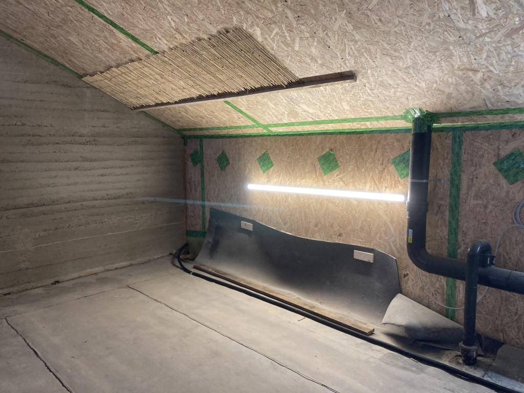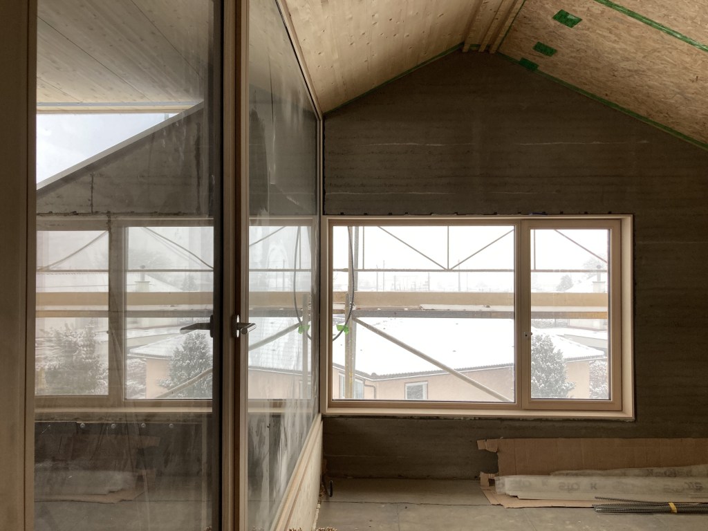 Eine der 2 Wohnungen Wohnung wird entkernt, der Dachstuhl mit höherem Kniestock und Gauben neu aufgebaut. Neue Räume und Oberflächen entstehen, das von Hand aufgebaute Gebäude aus den 60er Jahren wird respektvoll auf die Anforderungen der neuen Bewohner/innen angepasst. POSITIF als Teil der Baucrew ist am Innenausbau beteiligt. Genutzte Materialien sollen möglichst ökologisch und wohngesund sein: Lehmputz, Lehmplatten, Holzfaserdämmung, Holzständerwerk, Schilfrohrmatten, Holzfenster und Holzböden.